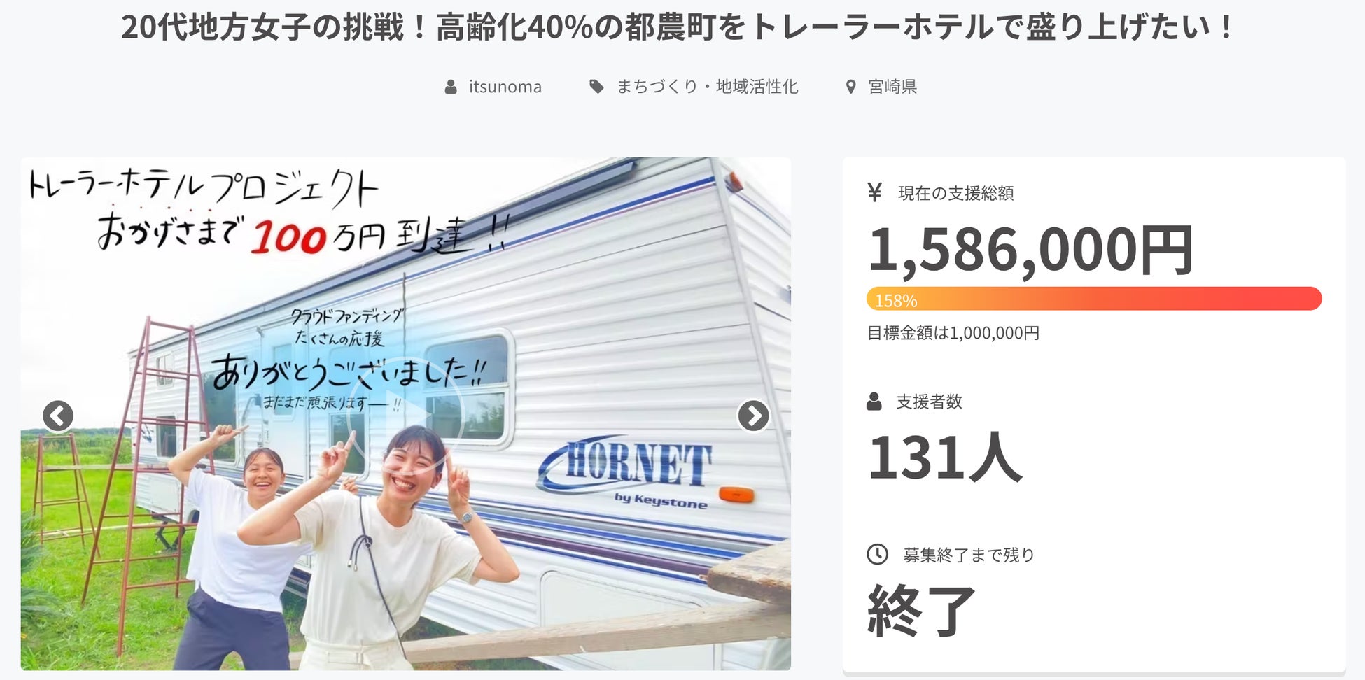 町内外の支援者131名の方々のお陰で目標金額を158%上回るご支援をいただき内外装補修を実現することができました。町内の支援者からは「都農町のためになるなら」「都農町に若い人が来てくれるなら」との期待をいただいています。