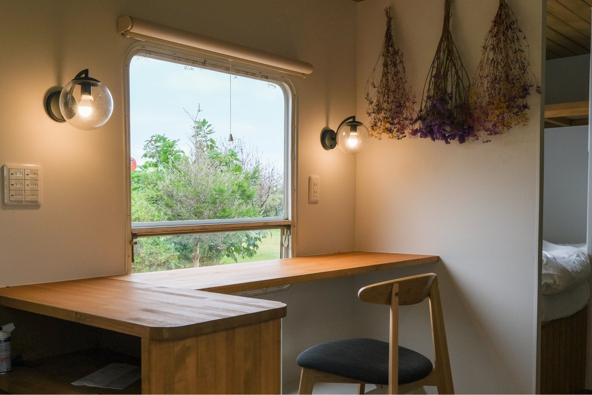 窓から見える畑を望みながら、ゆったりワーケーションができるように、広めのカウンターデスクを設けました。