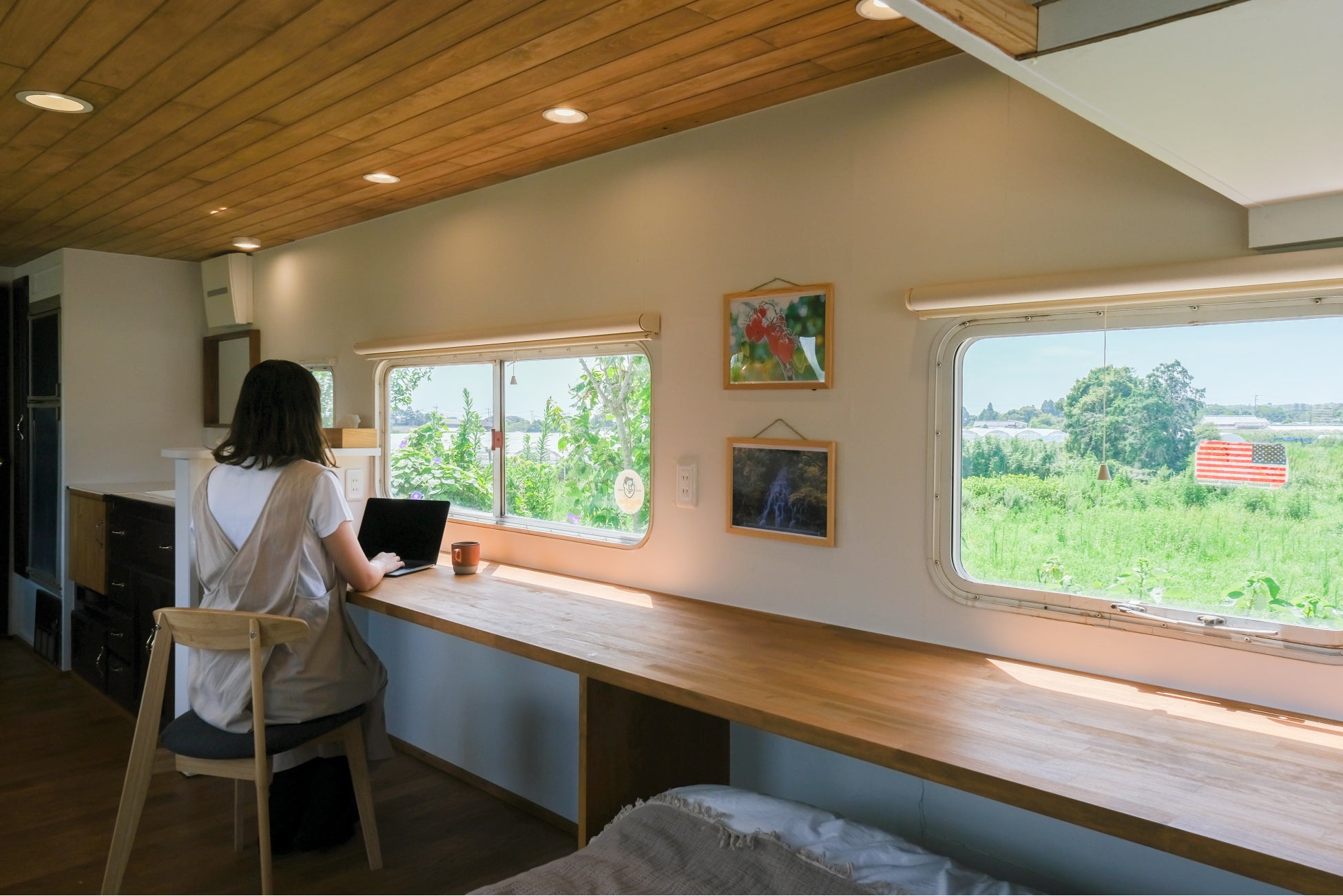 内装はトレーラーそのものの居心地を活かすため、天井と床は木材で仕上げ、なるべくシンプルに。